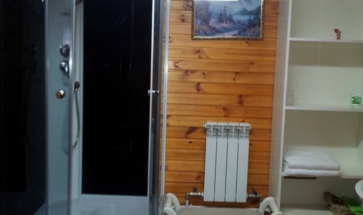 Санузел: душ, раковина, унитаз, тапочки, туалетные принадлежности, фен, халат