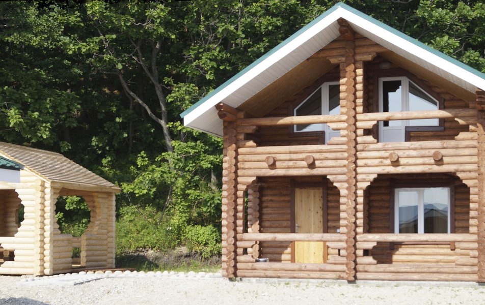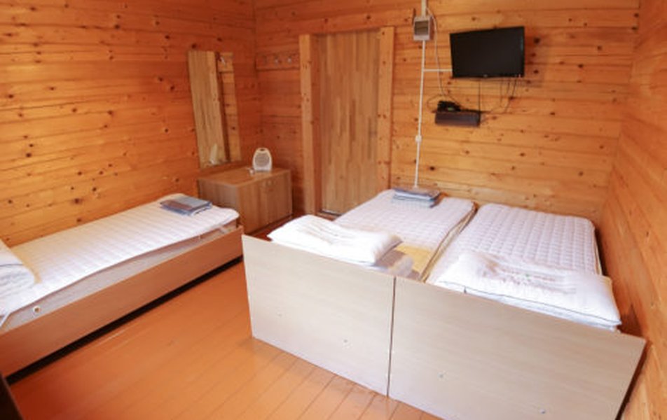 В домике: кровати односпальные, кухонная мебель, прикроватные тумбочки, стол, стулья, мини-кухня, мини-холодильник, набор посуды, плита электрическая, телевизор, электрочайник