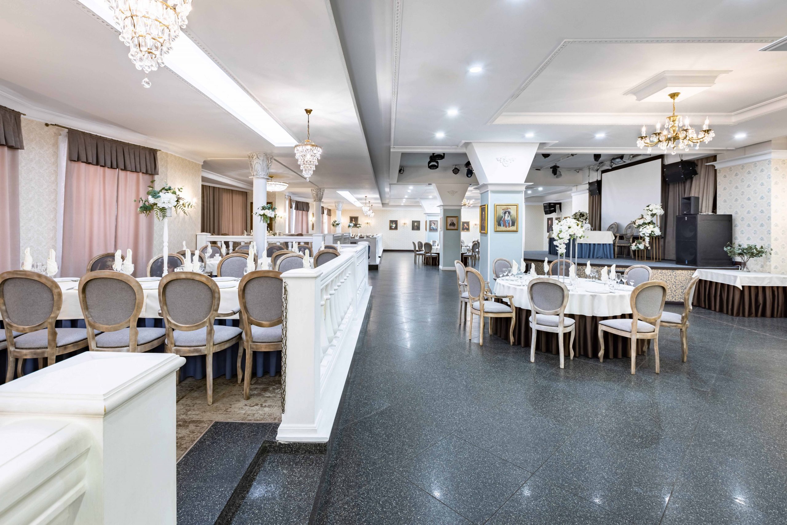 Подходит как для торжественного мероприятия, так и для деловых встреч среднего масштаба. Просторный зал в нежных, светлых тонах состоит из двух уровней. На втором уровне — уютные балконы и диванная зона. Здесь можно разместить гостей для частной беседы или организовать досуг для маленьких гостей. Зал оборудован экраном, проектором, всей необходимой звуковой и световой техникой для проведения торжеств любого формата.
