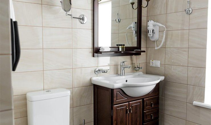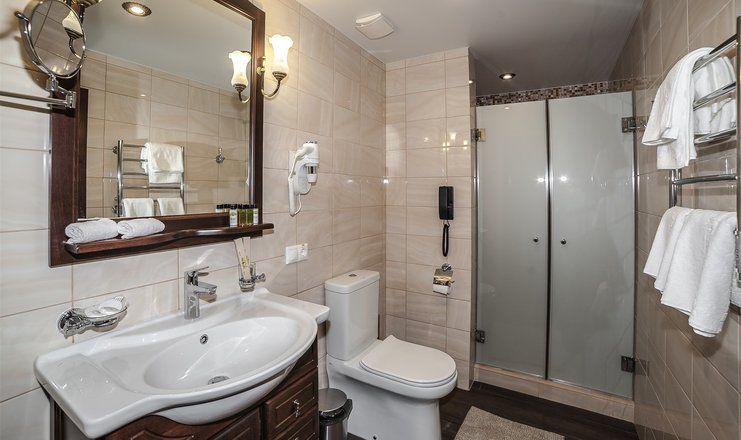 Санузел: душевая кабина, раковина, унитаз, фен, гигиенические принадлежности