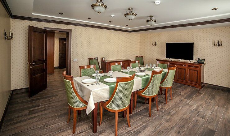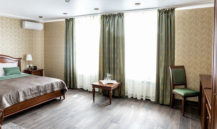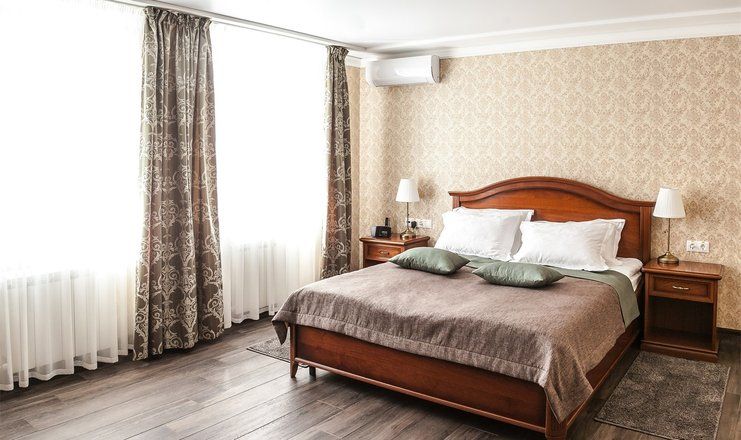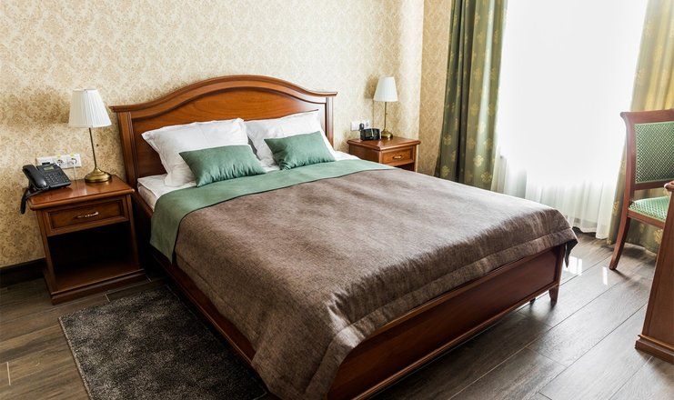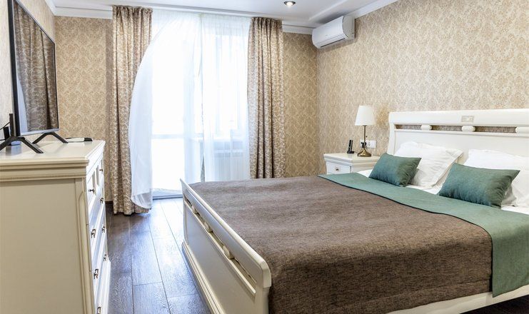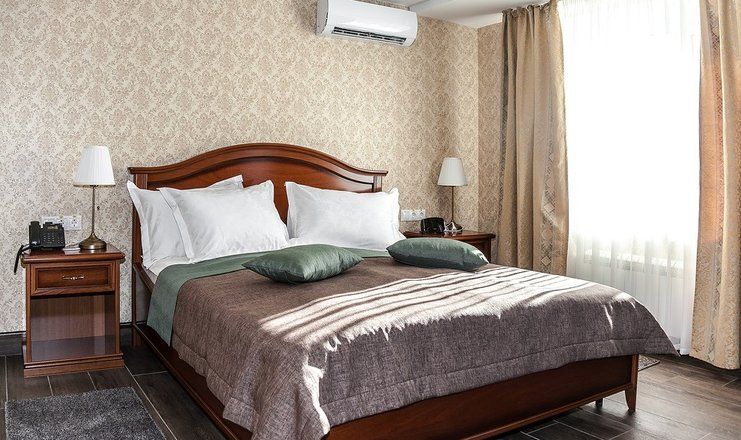В номере: кровать двуспальная, прикроватные тумбочки, стол, стулья, шкаф, кондиционер, мини-холодильник, набор посуды, телевизор, телефон, электрочайник