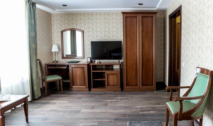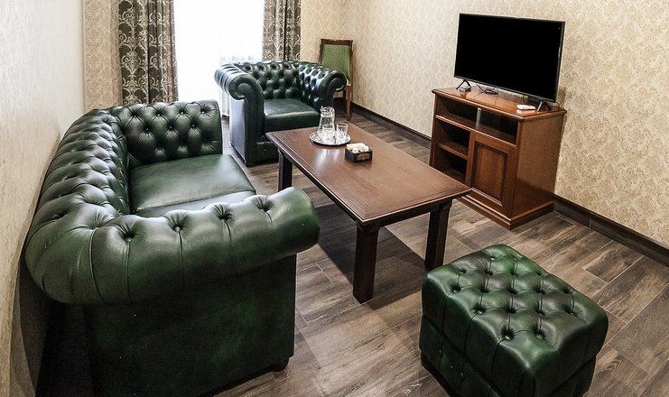 В номере: две комнаты: спальня и гостиная, кровать двуспальная, прикроватные тумбочки, стол, стулья, набор мягкой мебели, журнальный столик, шкаф, кондиционер, мини-холодильник, набор посуды, телевизор, телефон, электрочайник, сейф
