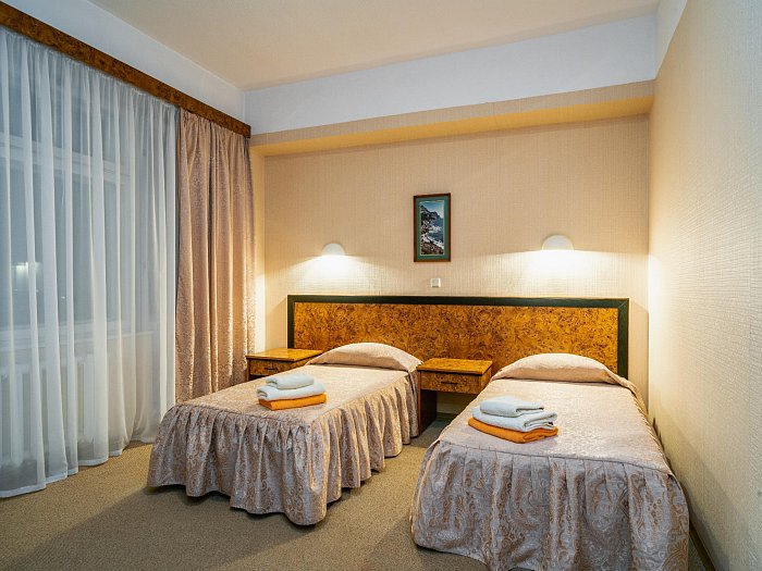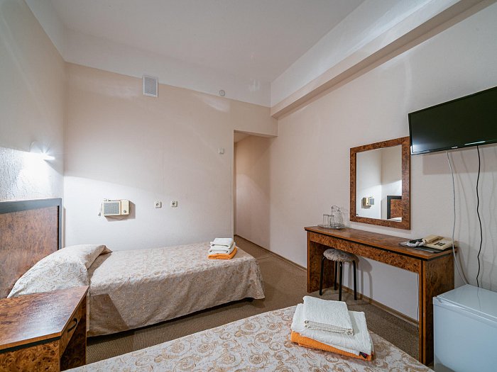 В номере: две односпальные кровати или одна двуспальная, прикроватные тумбы, зеркало, шкаф для одежды, сейф, письменный  стол, телевизор, кондиционер, фен, холодильник, Wi-Fi