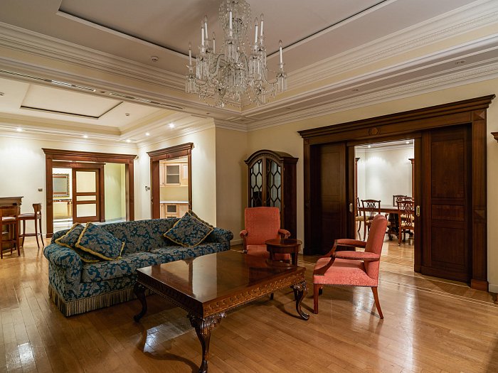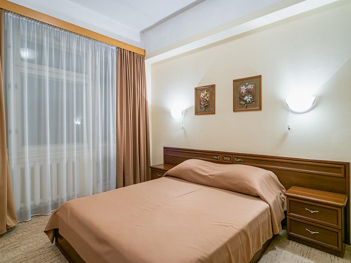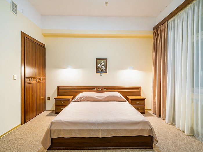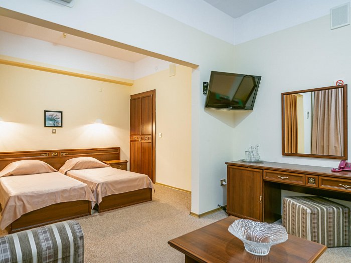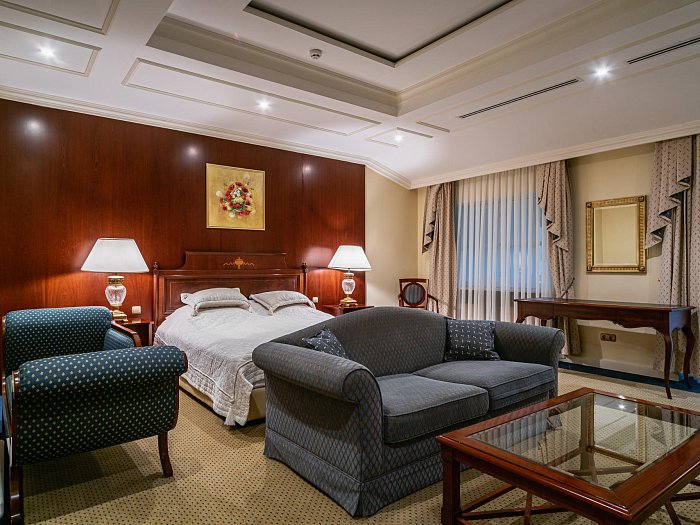 В номере: две комнаты: спальня и гостиная, односпальные кровати или одна двуспальная, прикроватные тумбы, зеркало, шкаф для одежды, пуфы, комод, мягкая мебель, журнальный стол, обеденный гарнитур, сейф, письменный  стол, телевизор, кондиционер, фен, холодильник, чайник, Wi-Fi