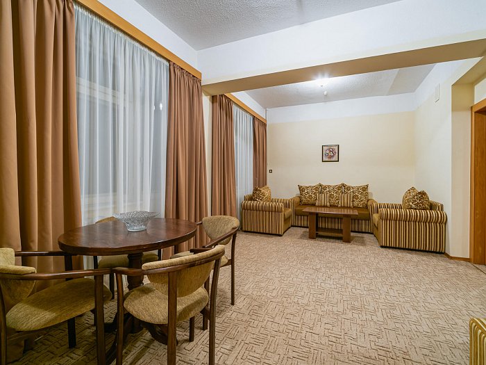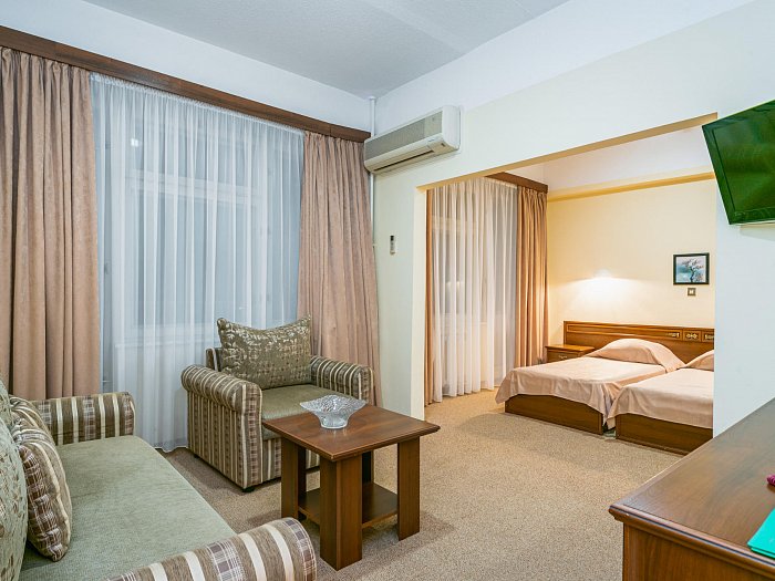 В номере: две комнаты: спальня и гостиная, односпальные кровати или одна двуспальная, прикроватные тумбы, зеркало, шкаф для одежды, мягкая мебель, журнальный стол, сейф, письменный  стол, телевизор, кондиционер, фен, холодильник, Wi-Fi