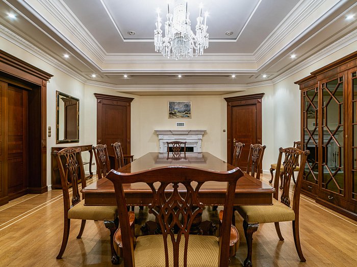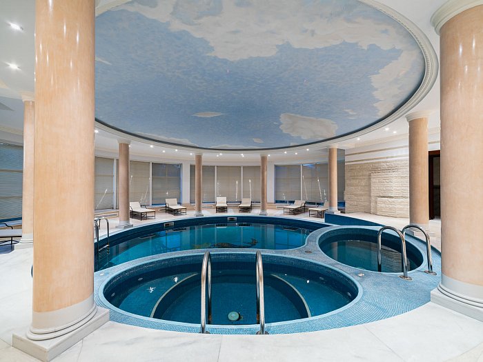 В номере: прихожая, гостиная, две спальни с гардеробом, две ванные комнаты, кухня, обеденный зал с камином, бильярдная, бассейн, сауна, кабинет для массажа, переговорной