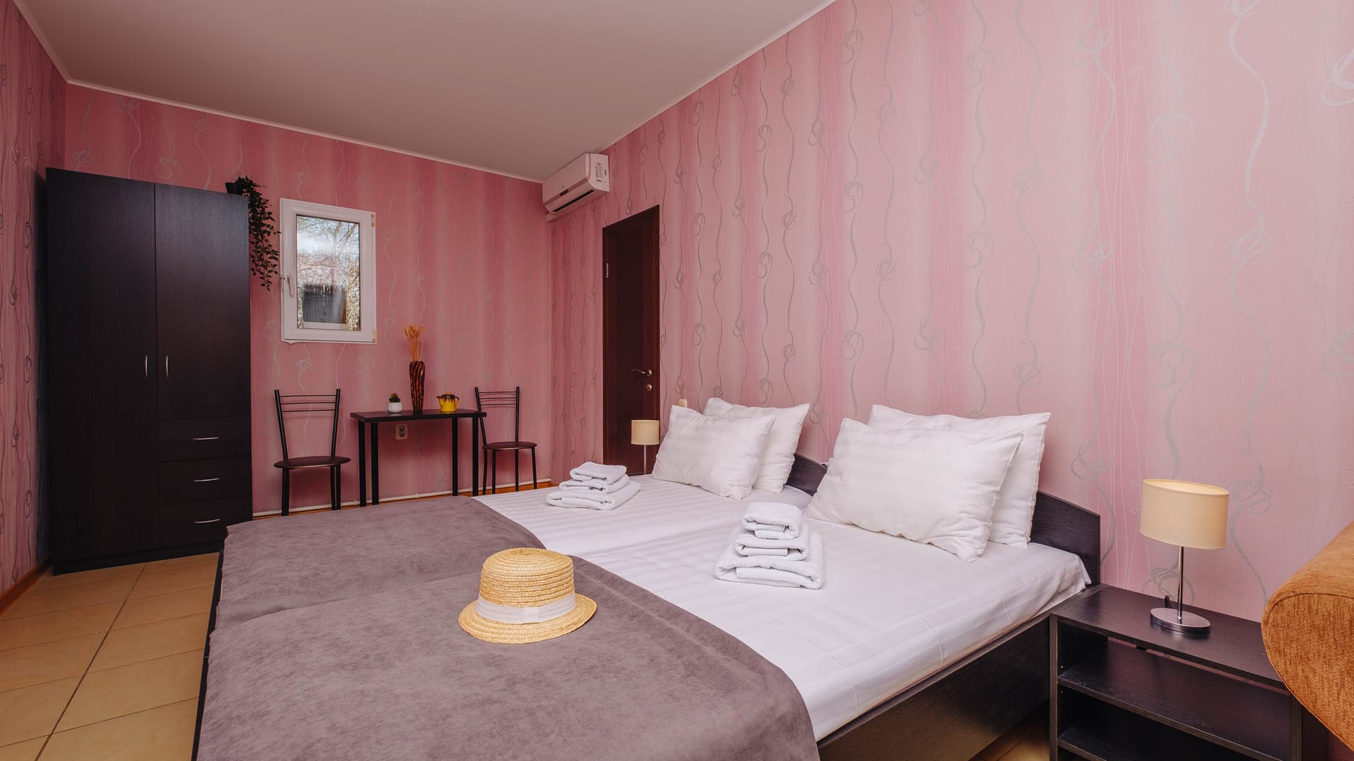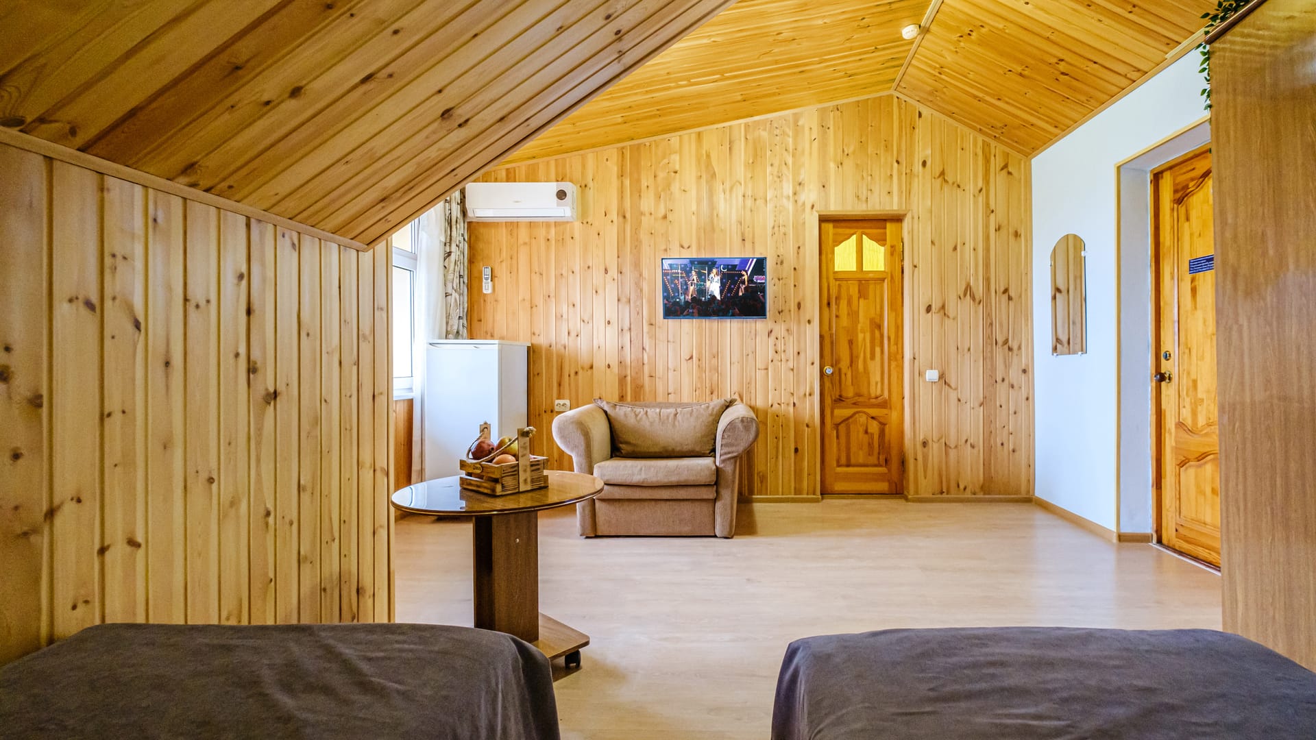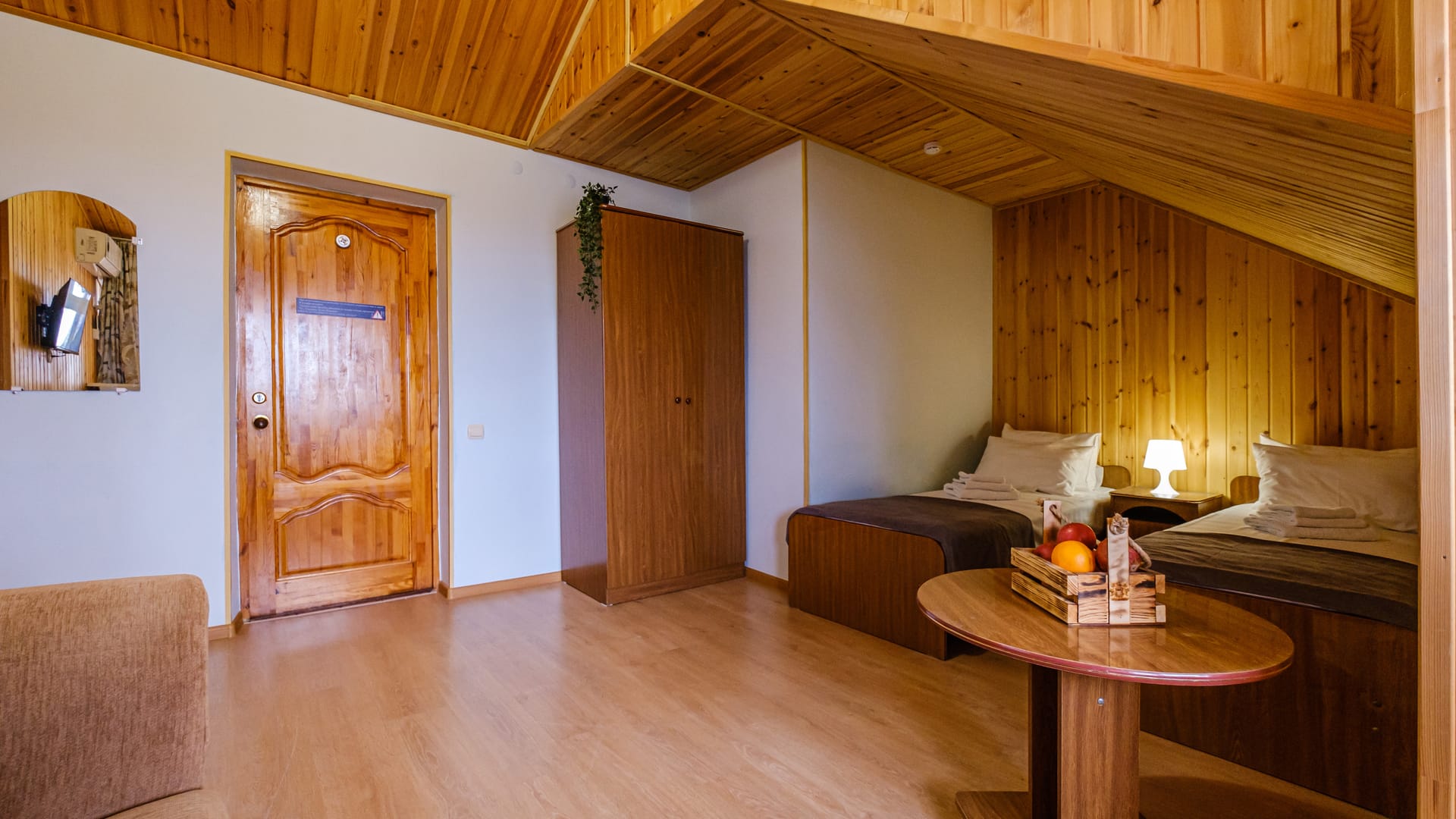 В номере: двуспальная кровать, односпальная кровать, прикроватные тумбы, стол, стулья, диван, журнальный стол, шкаф, холодильник, плоский телевизор, кондиционер, чайник, утюг (на этаже)