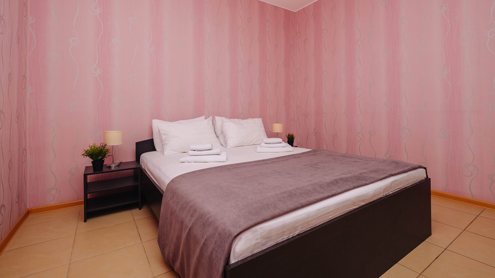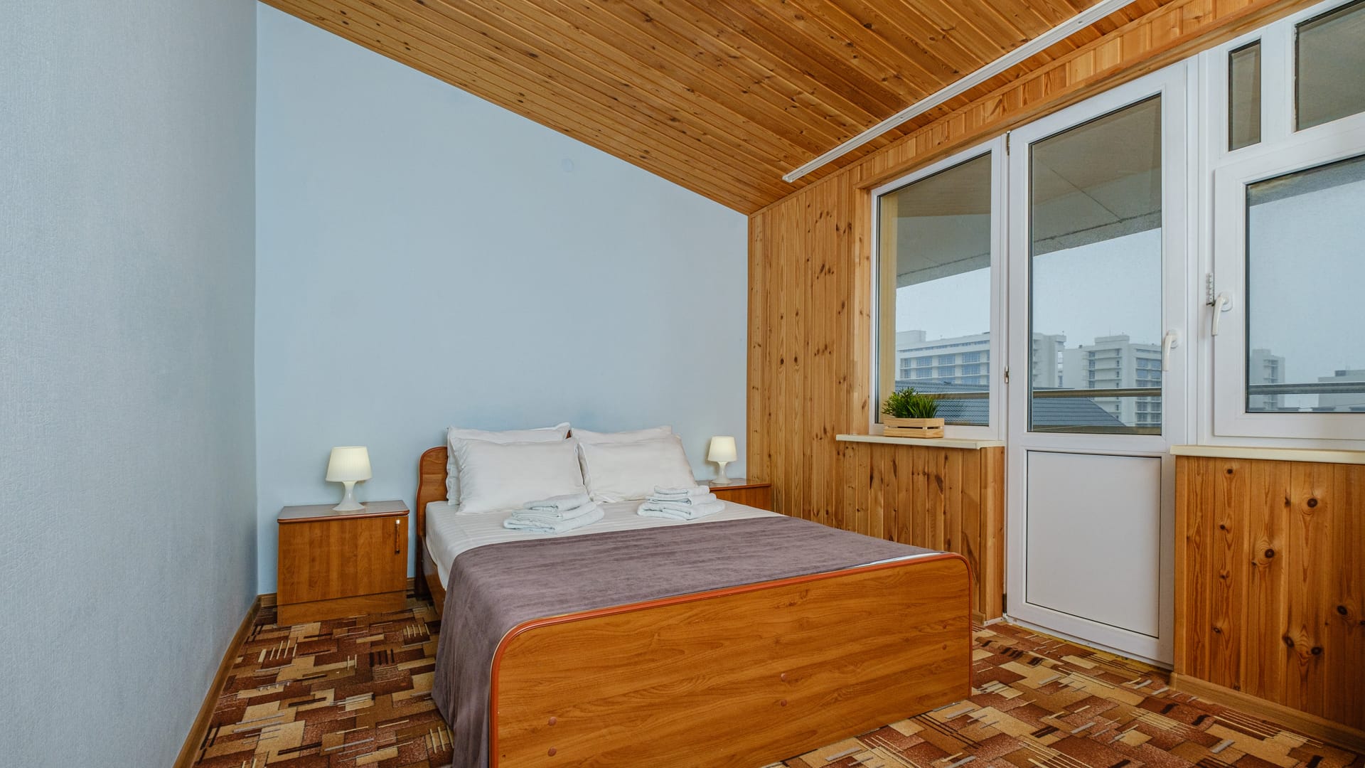 В номере: двуспальная кровать, прикроватные тумбы, стол, стулья, диван или кресло-кровать, шкаф, холодильник, плоский телевизор, кондиционер, чайник, утюг (на этаже)
