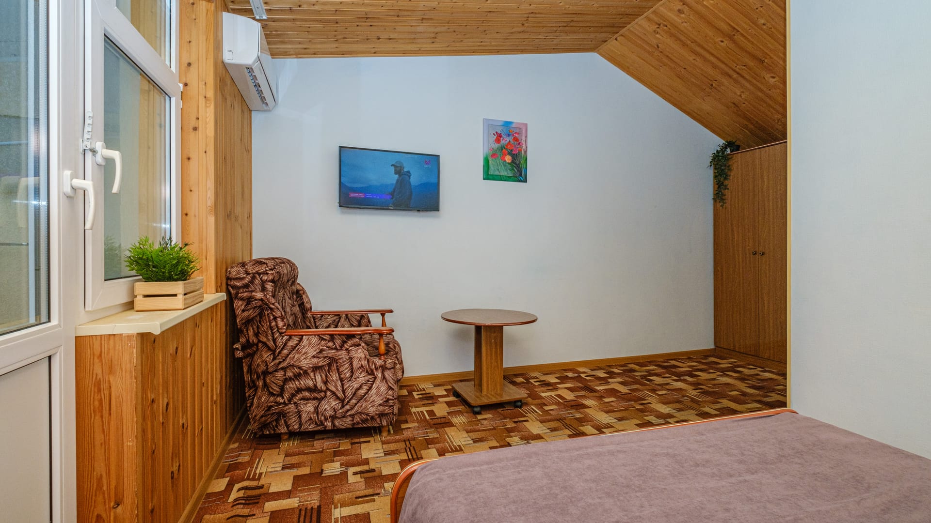 В номере: двуспальная кровать, прикроватные тумбы, стол, стулья, диван, шкаф, холодильник, плоский телевизор, кондиционер, чайник, утюг (на этаже)