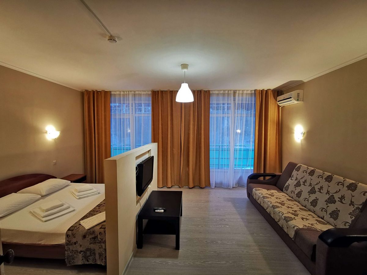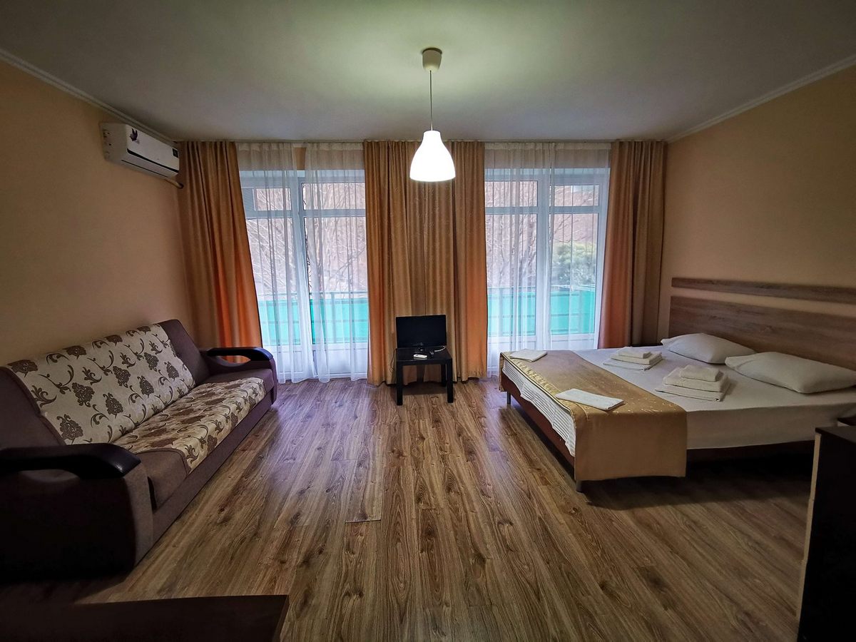 В номере: двуспальная кровать, прикроватные тумбы, стол, стул, диван, шкаф, комод, телевизор, холодильник, кондиционер, электрочайник