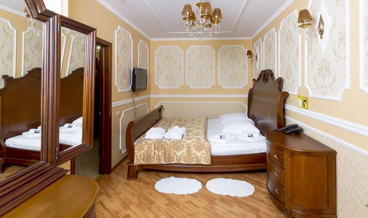 В номере: диван, зеркало, комод, кровать двуспальная, кухонная мебель, прикроватные тумбочки, стол, стулья, шкаф, гладильная доска, кондиционер, микроволновая печь, набор посуды, плита электрическая, сейф, телевизор, телефон, утюг, холодильник, чайный набор посуды, электрочайник