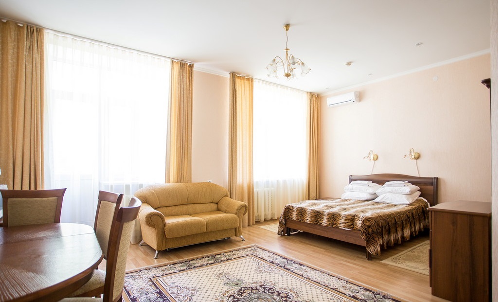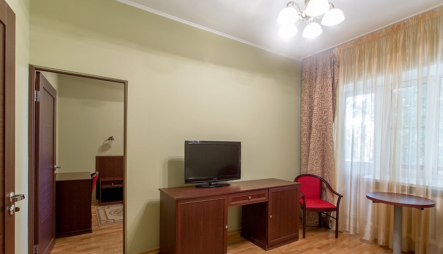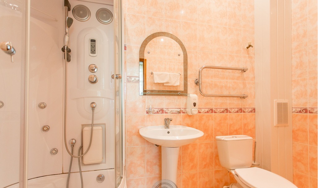 В номере: телевизор, холодильник, чайник, фен, кондиционер, двуспальная кровать, душевая кабина, микроволновая печь, утюг