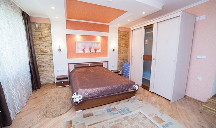 В номере: две комнаты: спальня и гостиная, кровать двуспальная, прикроватная тумбочка, стол, стул, шкаф, набор мягкой мебели, телевизор, холодильник, чайный набор посуды, электрочайник