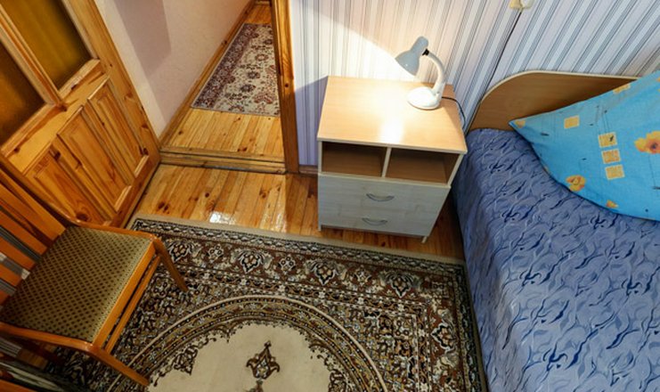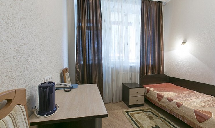 В номере: кровать односпальная, прикроватная тумбочка, стол, стул, шкаф, телевизор, холодильник, чайный набор посуды, электрочайник