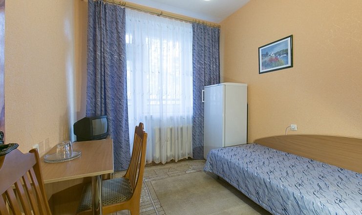 В номере: кровать односпальная, прикроватная тумбочка, стол, стул, шкаф, диван, телевизор, холодильник, чайный набор посуды, электрочайник