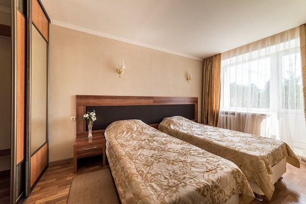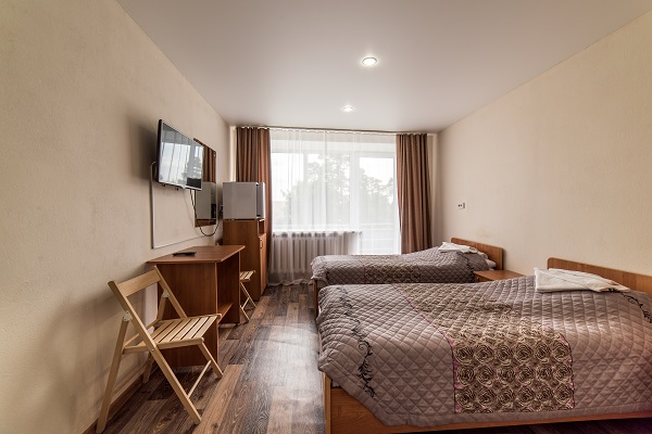 В номере: две или три односпальные кровати, прикроватные тумбы, шкаф, журнальный столик, телевизор, холодильник, чайный набор посуды, электрочайник