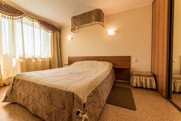 В номере: две комнаты: спальня и гостиная, двуспальная кровать, прикроватные тумбы, шкаф, журнальный столик, раскладной диван, телевизор, холодильник, чайный набор посуды, электрочайник, DVD, сейф