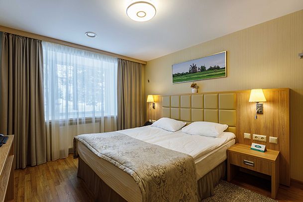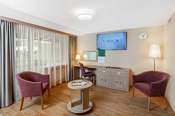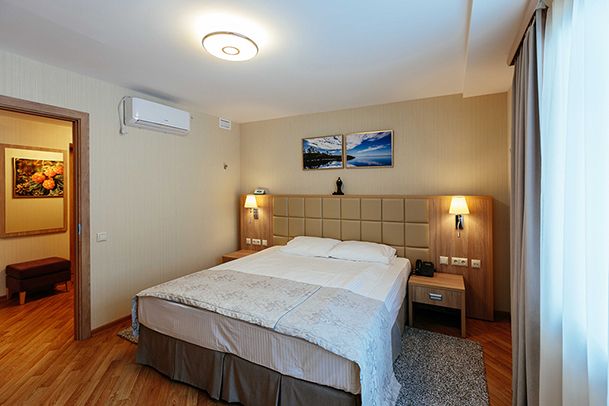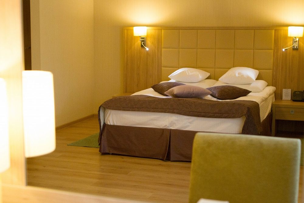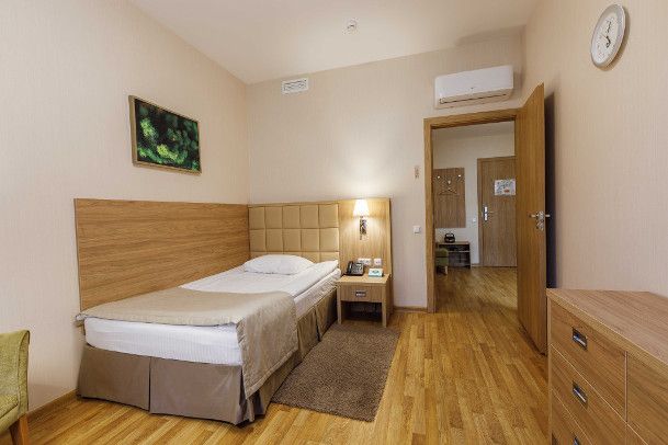 В номере: спальня и процедурная комната, две односпальные кровати либо одна двуспальная, прикроватные тумбы, стол, стул, кресло, журнальный стол, телевизор, холодильник, кондиционер, ИК-сауна