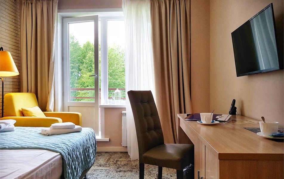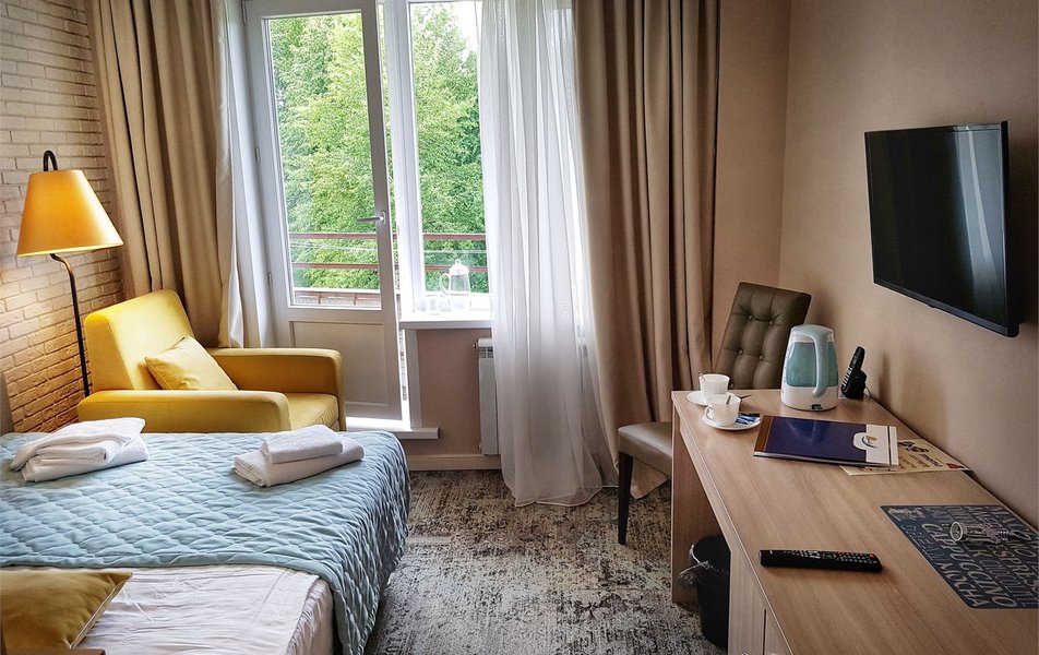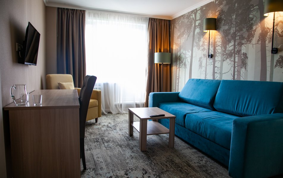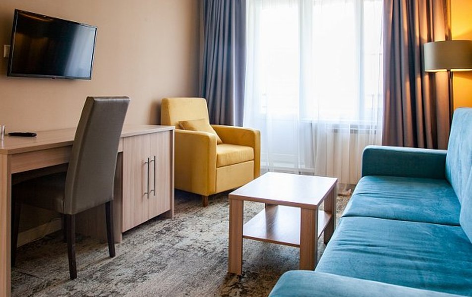 В номере: раскладной диван, кресло, 2 стула, журнальный столик, шкаф, письменный стол, холодильник, 2 TV, большая кровать или две односпальные кровати, торшер, 2 прикроватные тумбочки, Wi-Fi