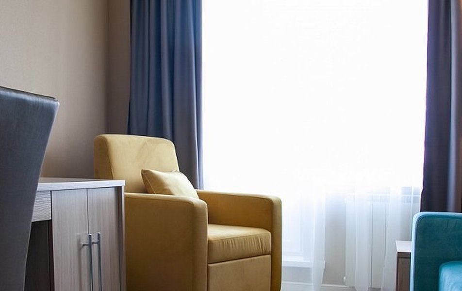 В номере: кресло, 1 стул, шкаф, письменный стол, холодильник, 1 TV, полутороспальная кровать, торшер, графин и стакан, Wi-Fi