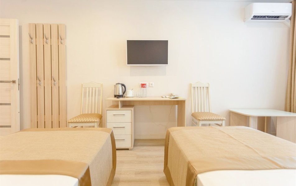 В номере: кровати односпальные, прикроватные тумбочки, стол, стулья, шкаф, кондиционер, мини-холодильник, телевизор, телефон, чайный набор посуды, электрочайник