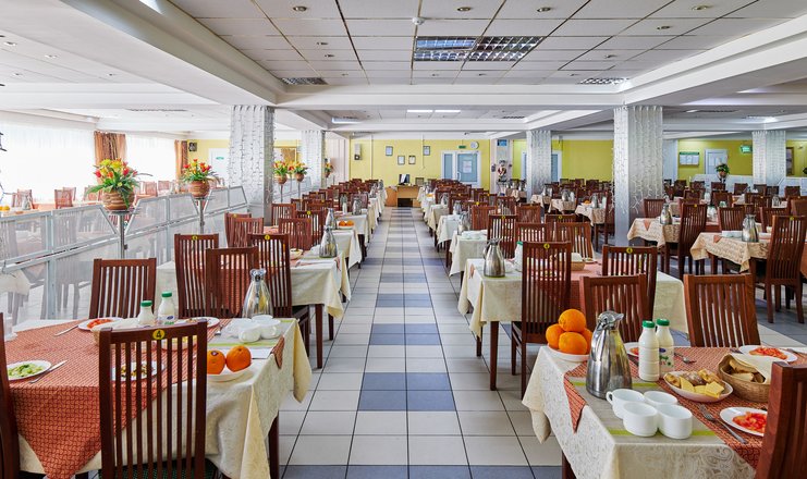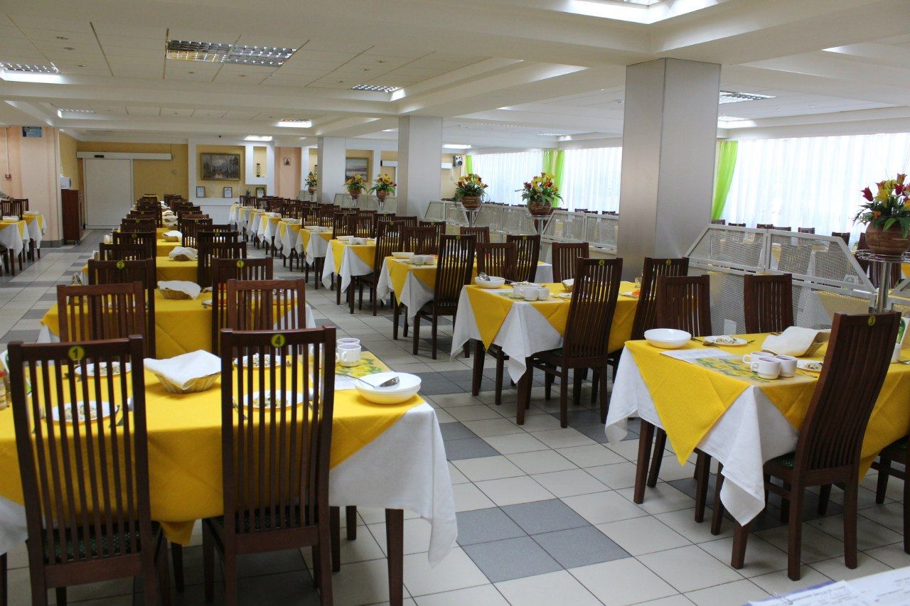 Пищеблок находится в главном корпусе санатория. Современный дизайн и музыкальное сопровождение создают уютную атмосферу. Для вашего удобства установлены микроволновые печи.  Обеденный зал рассчитан на 320 человек, в том числе 100 посадочных мест – отделение «Мать и дитя».