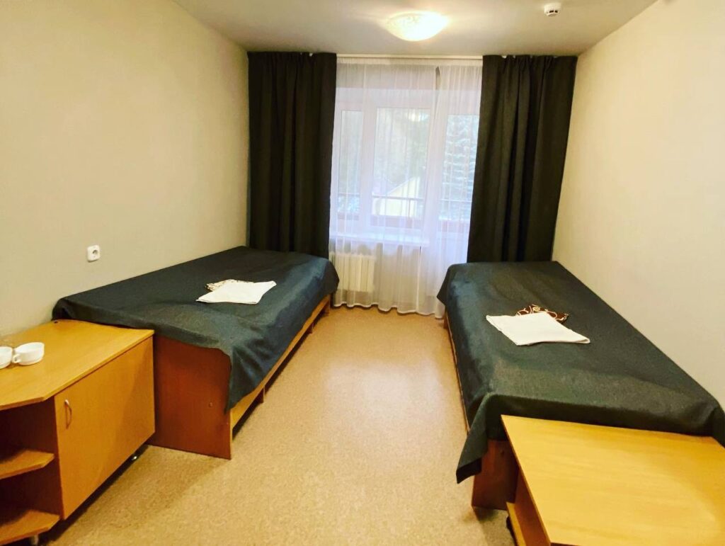 В номере: вешалка, зеркало, комод, кровати полутороспальные, стол, шкаф, мини-холодильник, набор посуды, телевизор