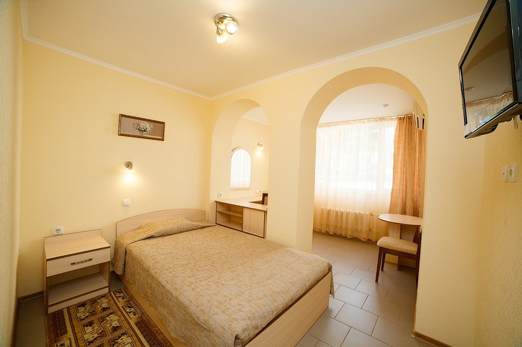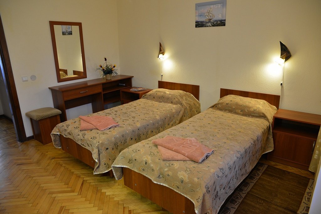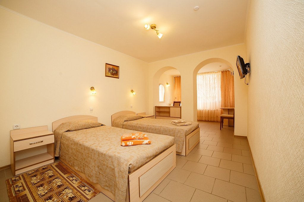 В номере: две односпальные кровати, прикроватные тумбы, стул, шкаф, столик журнальный, кондиционер, телевизор, телефон, холодильник