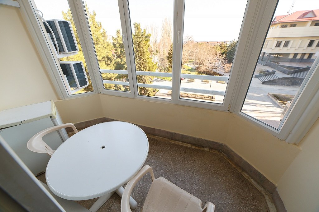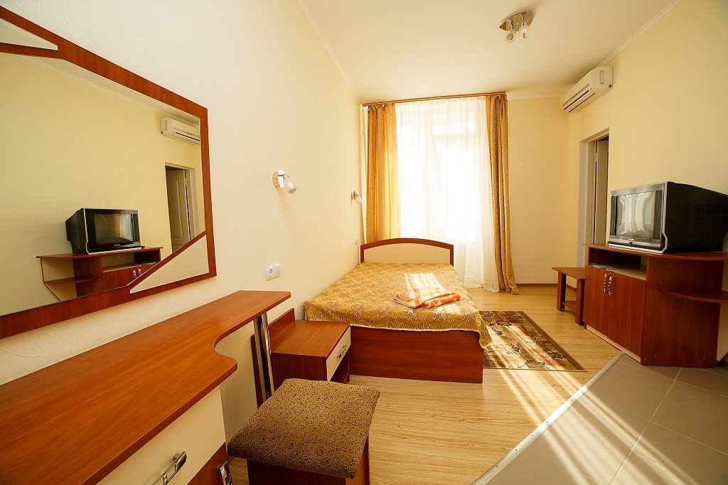 В номере: кровать односпальная, прикроватная тумбочка, стул, шкаф, кондиционер, телевизор, телефон, холодильник