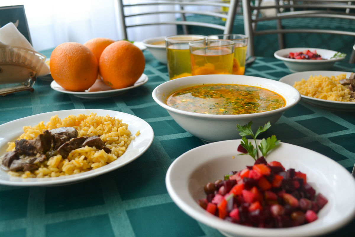 Столовая имеет следующие часы работы: завтрак с 8:00 до 10:00, обед с 13:00 до 15:00, полдник с 16:30 до 17:00 и ужин с 18:30 до 20:00.