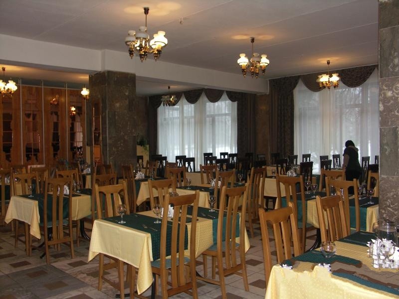 В санатории «Зеленый городок» организовано 3-х разовое питание по системе «шведский стол». Кроме того, в меня включены диетические блюда. Летом на берегу реки Скамбла работает летнее кафе, где вы можете насладиться прекрасным шашлыком, приготовленным на углях. Бар санатория предлагает свежевыжатый сок.
