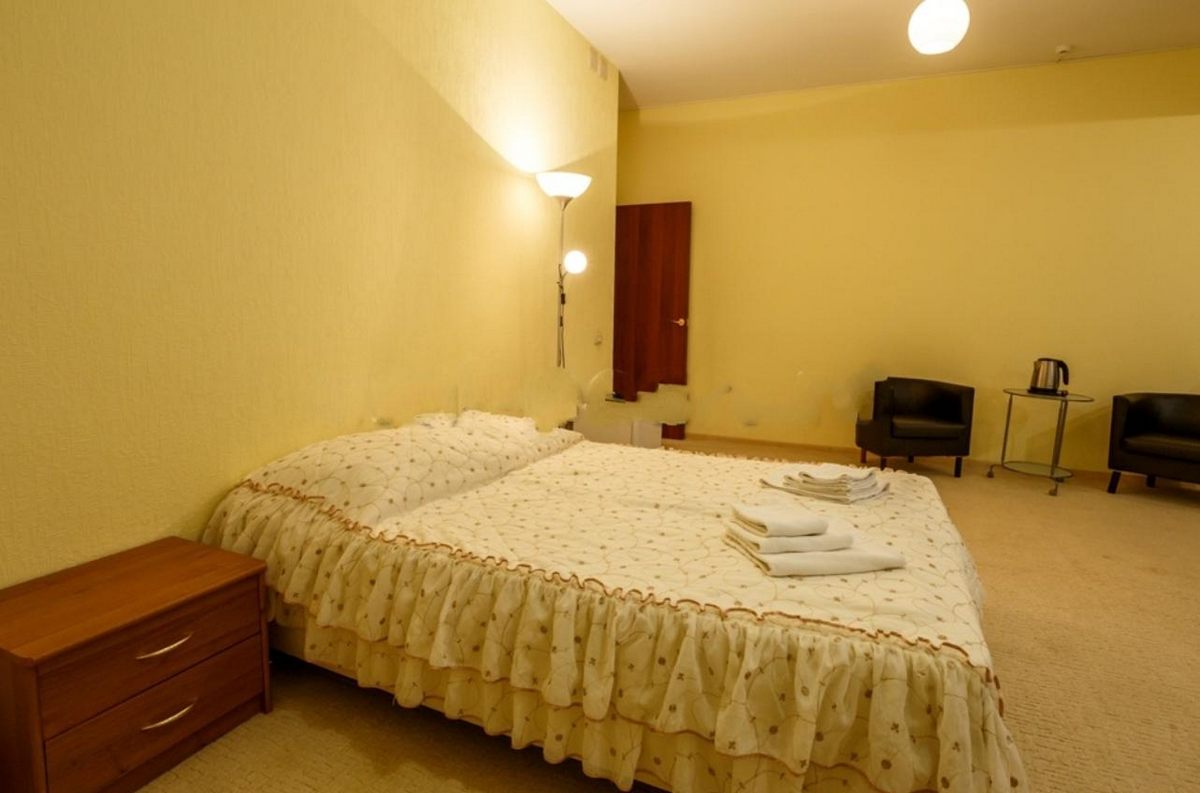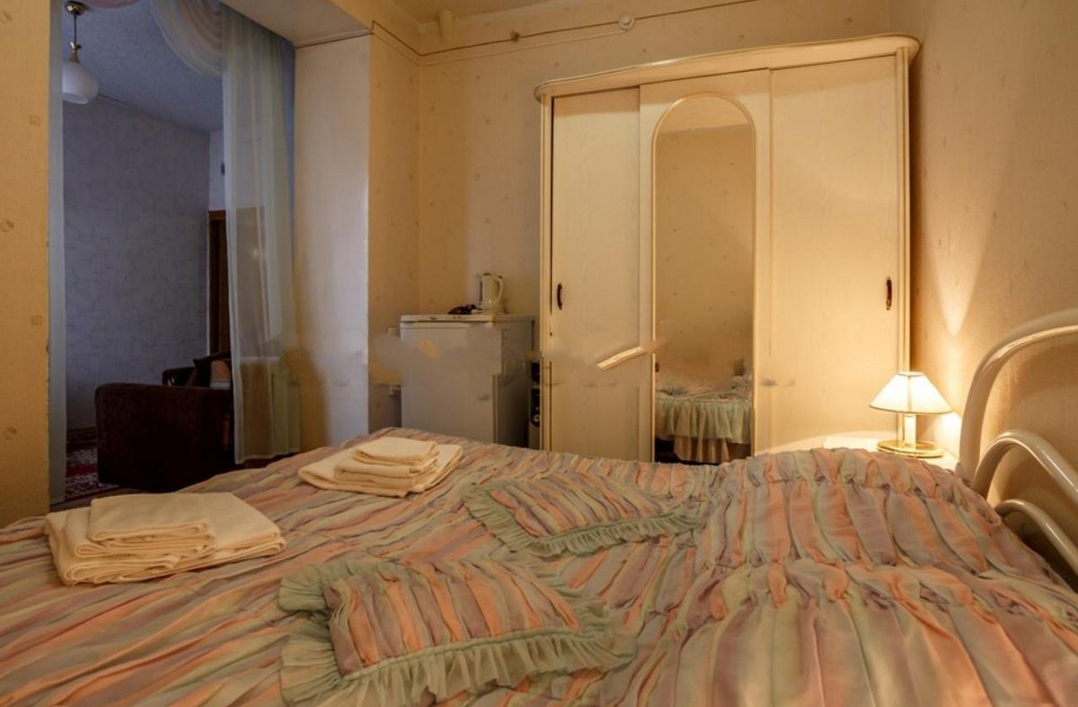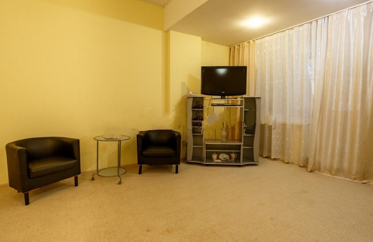 В номере: две комнаты, в одной комнате – мягкий уголок (уголок раскладывается), журнальный столик; в другой комнате – спальня с двуспальной кроватью, прикроватная тумбочка, шкаф, телевизор, телефон, холодильник, электрический чайник, чайный сервиз