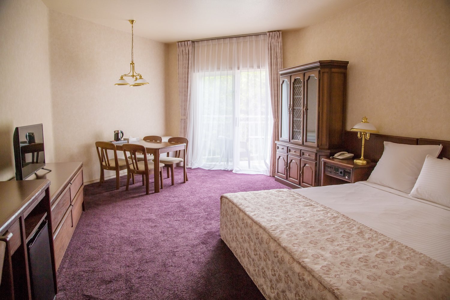 В номере: вешалка, зеркало, кровать двуспальная, прикроватные тумбочки, стол, стулья, шкаф, индивидуальная система обогрева, кондиционер, мини-холодильник, сейф, телевизор, телефон, электрочайник