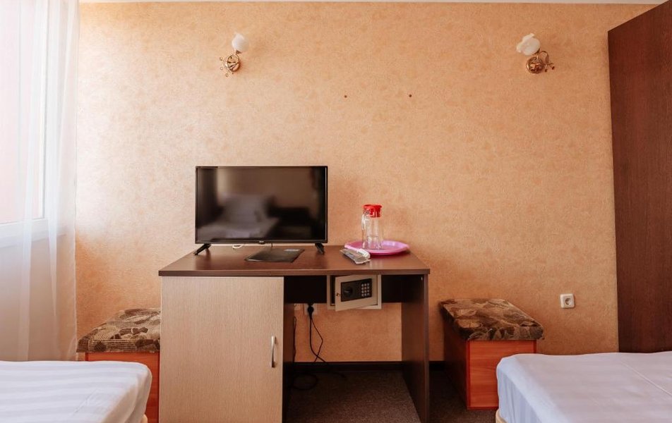 В номере: две 1,5 спальные или одна 2-ух спальная кровать, телевизор, кондиционер, холодильник, телефон, набор посуды, сейф.
