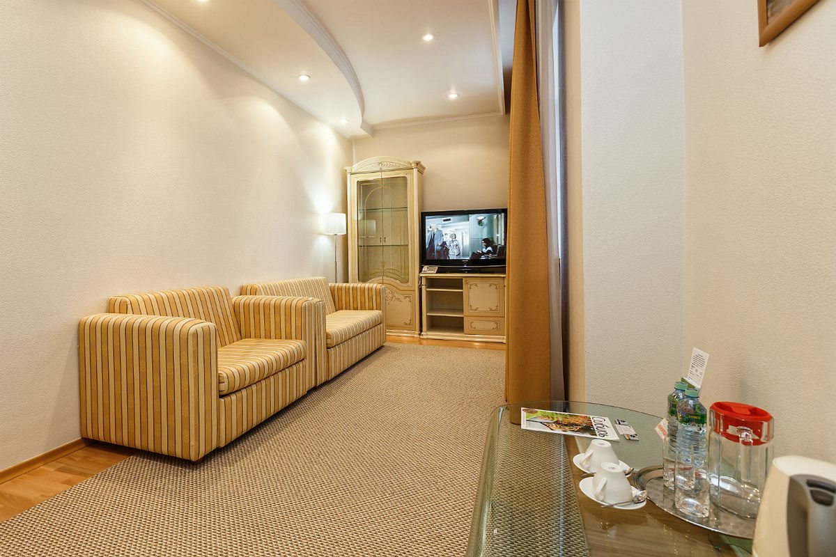 В номере: две комнаты: спальня и гостиная, 2 односпальые кровати, прикроватные тумбочки, столы туалетный и журнальный, шкаф, диван, телевизор, телефон, холодильник, чайник, сушилка для белья