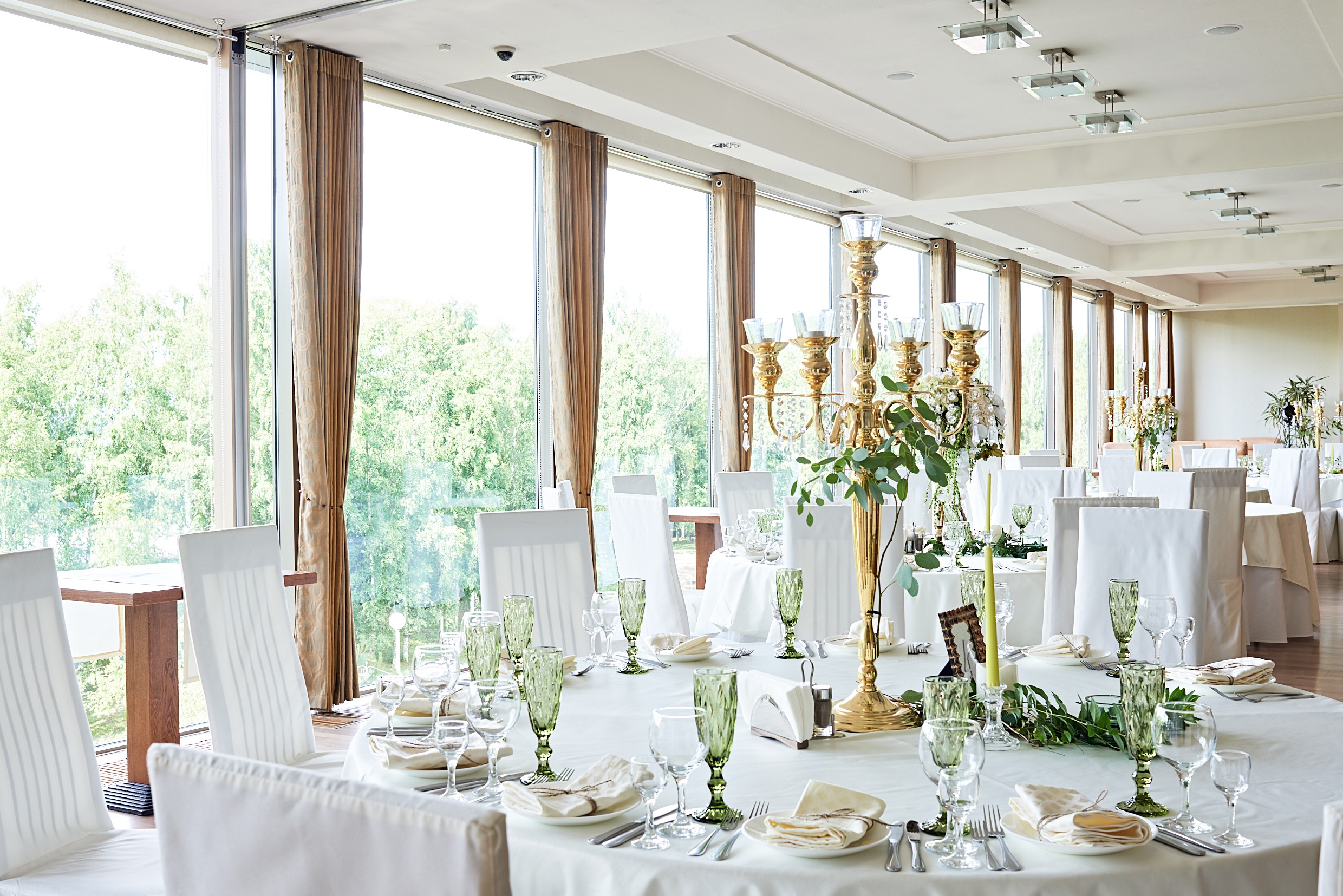 Для трогательной семейной церемонии замечательно подойдет уютный Панорамный зал ресторана отеля с панорамными окнами с видом на парк и озеро. Если у вас запланирован грандиозный праздник, воплотить мечту можно в большом зале ресторана. Планировка, размеры и освещение зала позволяют осуществить любое дизайнерское решение в оформлении, комфортно разместить до 250 гостей, устроить фотозону, candy bar, уголок пожеланий и зону танцев.