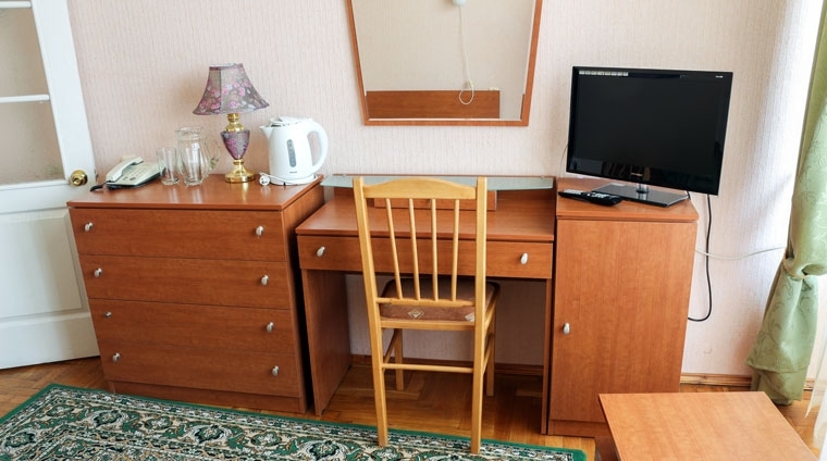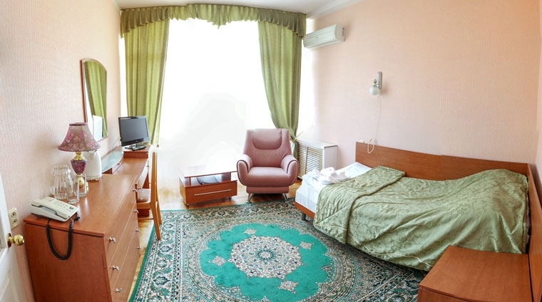 В номере: 1,5 спальная кровать, прикроватная тумбочка, светильник, стул, кресло, журнальный столик, туалетный столик с зеркалом, электрочайник, набор посуды, телевизор на тумбе, холодильник, телефон, кондиционер.