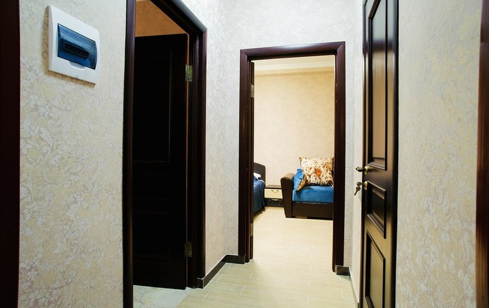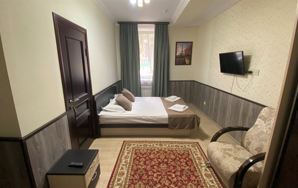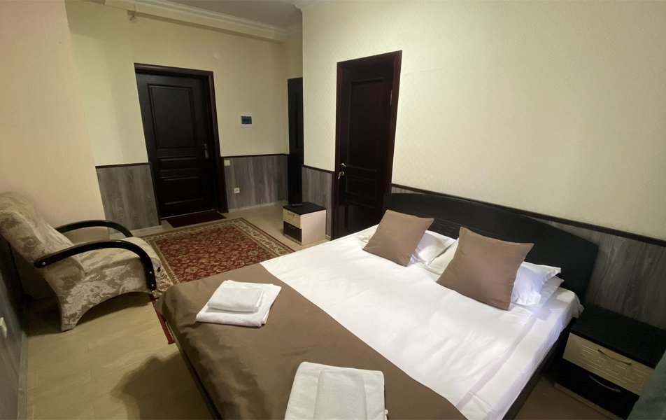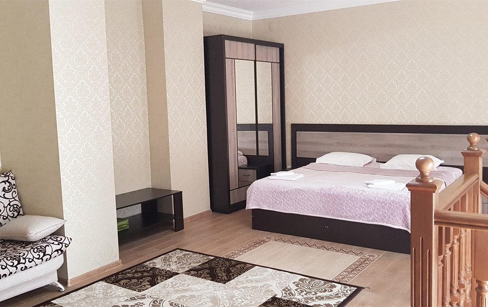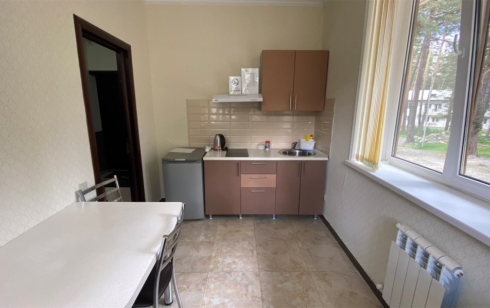 В номере: вешалка, диван раскладной, зеркало, кровать двуспальная, прикроватные тумбочки, стол, стулья, шкаф, Мини-кухня, набор посуды, плита электрическая, телевизор, холодильник, чайный набор посуды, электрочайник