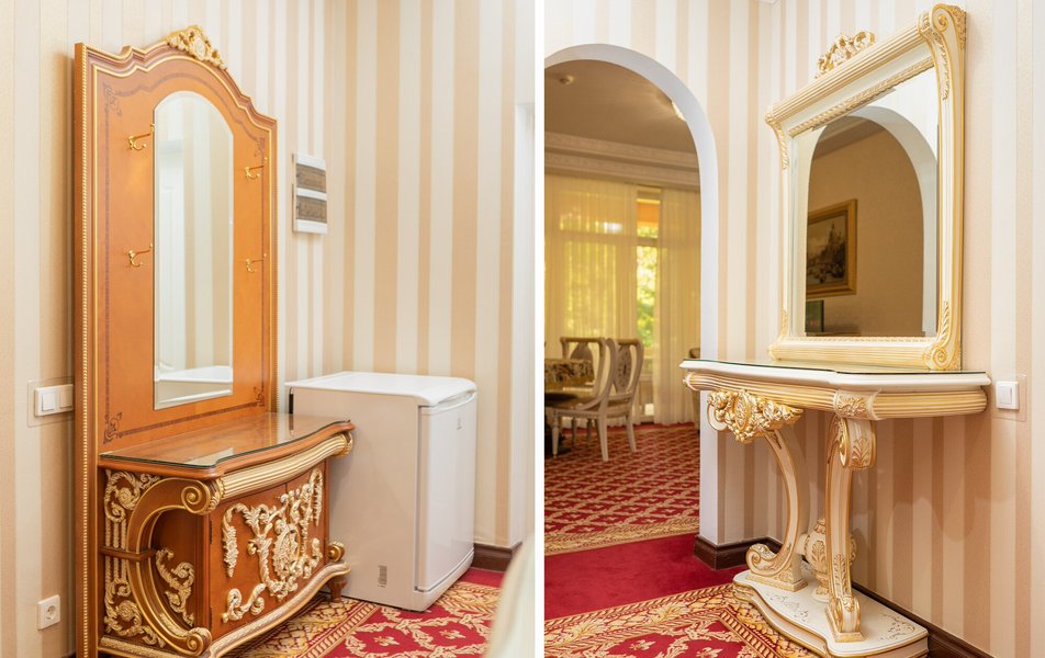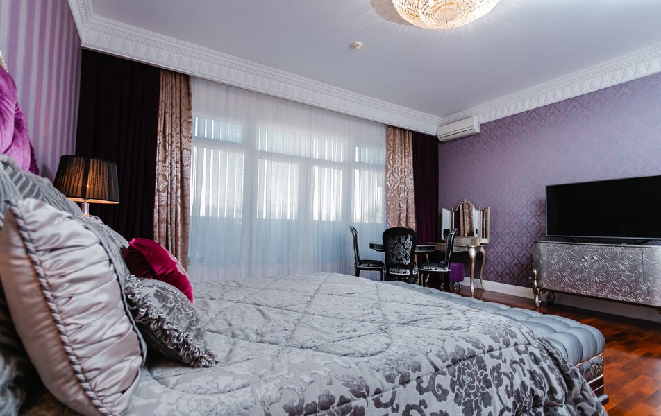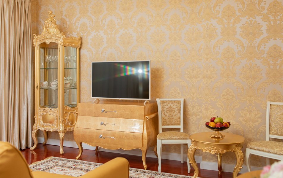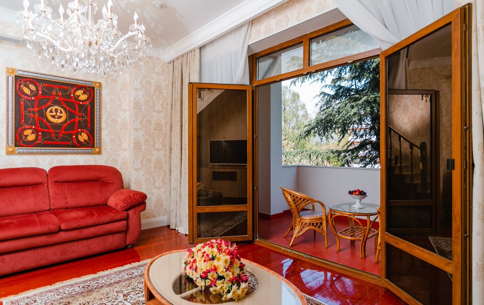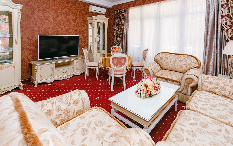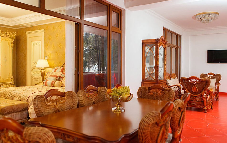 В номере: диван, комод, набор мягкой мебели, прикроватные тумбочки, стол, стулья, шкаф для посуды, кондиционер, телевизор, холодильник, электрочайник