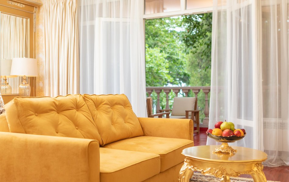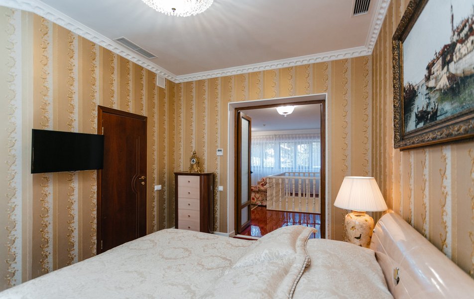 В номере: комод, кровать двуспальная, набор мягкой мебели, прикроватные тумбочки, диван, шкаф для посуды, кондиционер, телевизор, холодильник, электрочайник