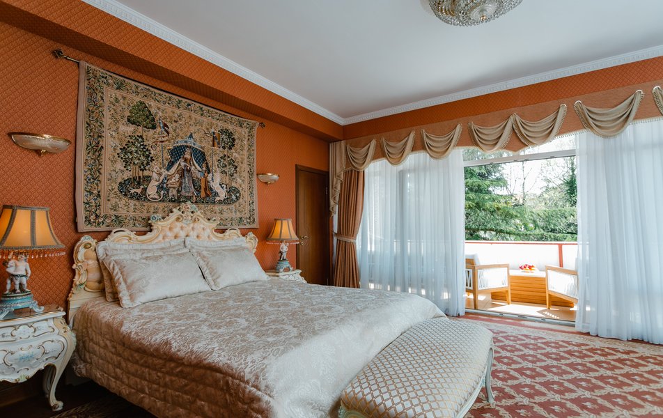 В номере: комод, кровать двуспальная, набор мягкой мебели, прикроватные тумбочки, шкаф для посуды, набор посуды, сейф, система общего кондиционирования, телевизор, холодильник, электрочайник